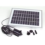 Add a fountain to your birdbath, pond, or any remote area of your landscape without running electricity with this solar-powered water pump from Newport Solar. The powerful, compact pump is easy to set up: just place the solar pump in your pond, fountain, or birdbath, fill with water, and place the solar panel in the sun. The pump will harness the sun's rays to provide a relaxing gurgle in the middle of your water feature. The 5-watt solar panel produces up to 360 liters per hour of water flow, with five different fountainheads providing a diverse waterfall design. Other details include a 6-volt DC pump voltage, a water lift height of 40 inches, an integrated filter, a 15-foot cable, and an aluminum bracket for the panel. The solar panel itself measures 18 by 12 inches.