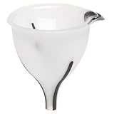OXO's three piece multi-purpose Funnel Set is ideal for transferring and straining soups, sauces, dry goods and more. Large and small funnels accommodate any size job, and the detachable strainer fits in both funnels for added versatility. Soft ribs on the neck of the funnels allows for a secure fit in all size bottle openings to prevent spilling, and the ribs allow air to escape so liquids pour in smoothly without splashing. Go ahead and pour steamy soup or hot fruit purees; the funnels and strainer are made of high-heat plastic. Soft handles on the funnels provide a firm grip, and the three pieces nest for compact storage.